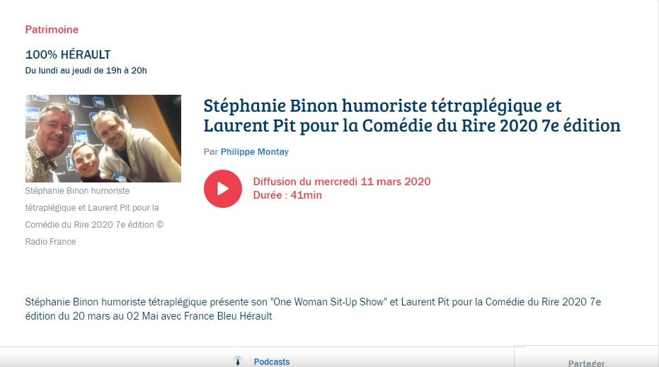 PresseFrance Bleu Hérault émission 100% HéraultStéphanie Binon humoriste tétraplégique présente son « One Woman Sit-Up Show » et Laurent Pit pour la Comédie du Rire 2020 7e édition du 20 mars au 02 Mai avec France Bleu Hérault. Confidences sur la cuvetteIl est joli ce portrait. Qui suis-je?