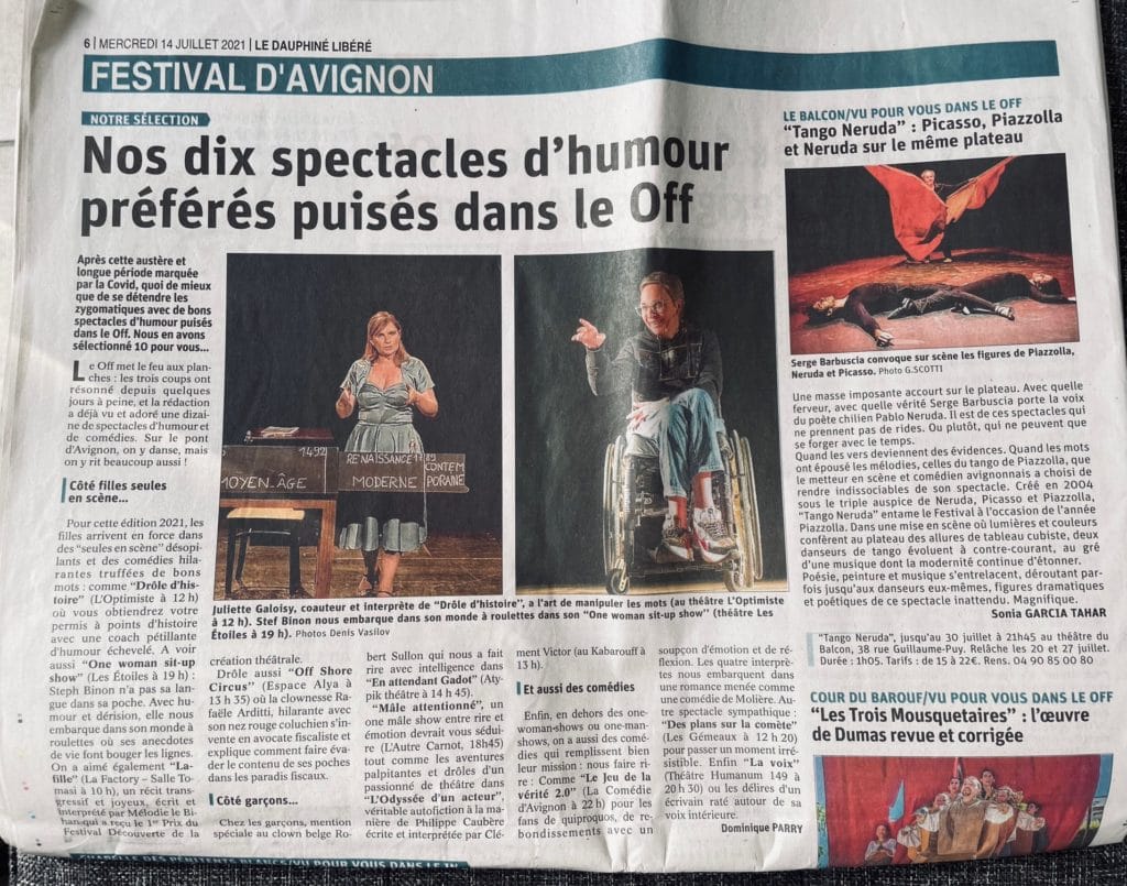 PresseLes dix spectacles du Off aimé par le Dauphiné LibéréJolie mise en lumière pour le One Woman Sit-Up Show par le Dauphiné Libéré au Festival Off d’Avignon 2021. Magazine Faire FaceStef joue dans le Off à Avignon