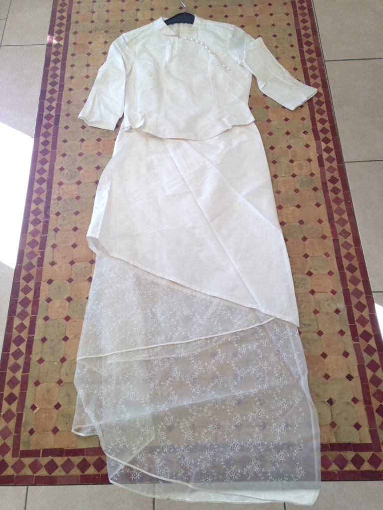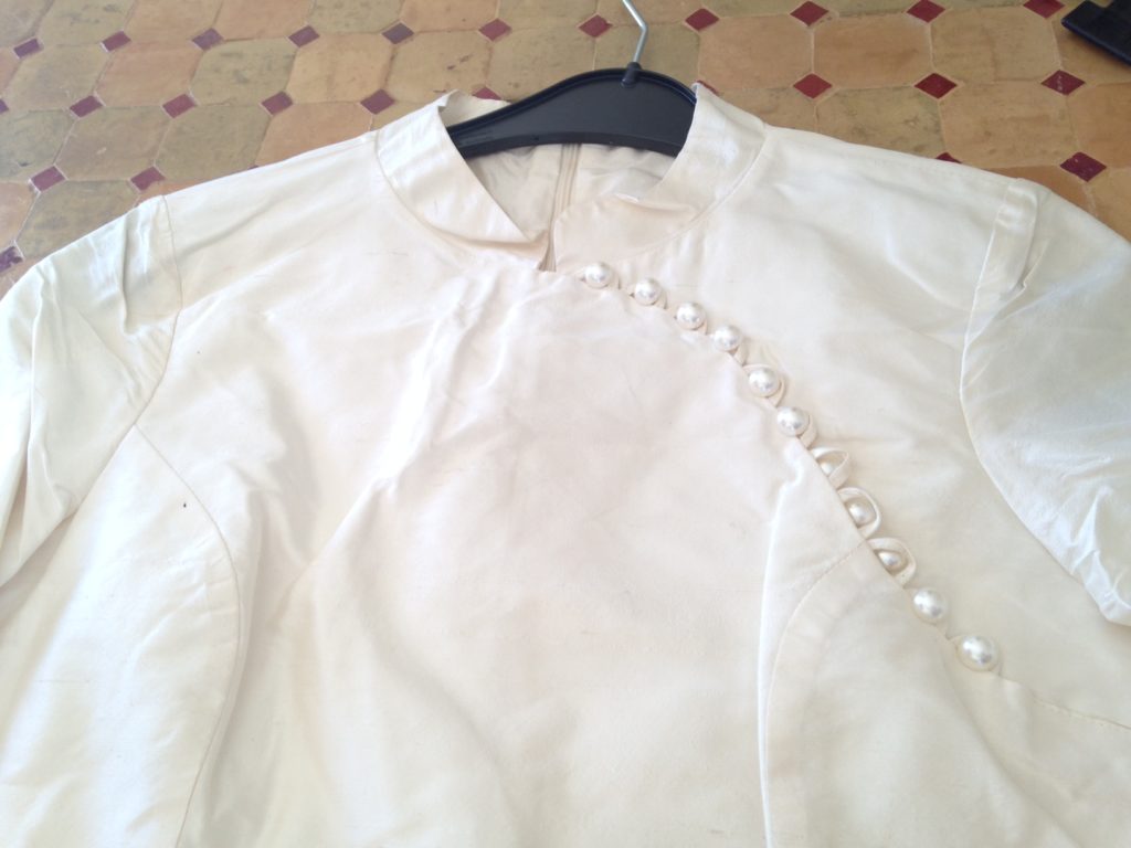 Je voulais un col Mao, des manches 3/4, et un système pratique à enfiler et enlever pour aller aux toilettes. Ah ben oui, même le plus beau jour de sa vie, on y échappe pas…