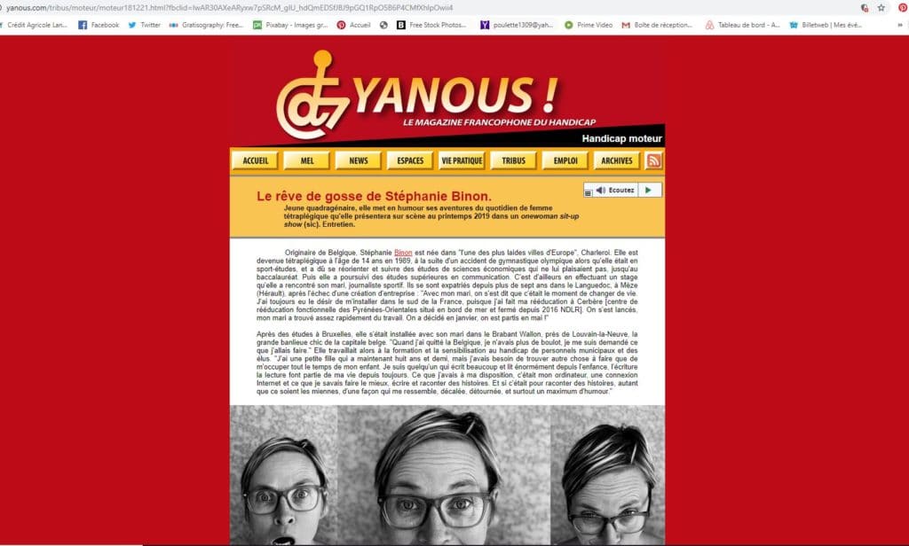 PresseYanous! Le magazine francophone du handicap.Le rêve de gosse de Stéphanie Binon.Jeune quadragénaire, elle met en humour ses aventures du quotidien de femme tétraplégique qu’elle présentera sur scène au printemps 2019 dans un onewoman sit-up show (sic). Entretien. Bronzage « halo »Cap ou pas cap?!